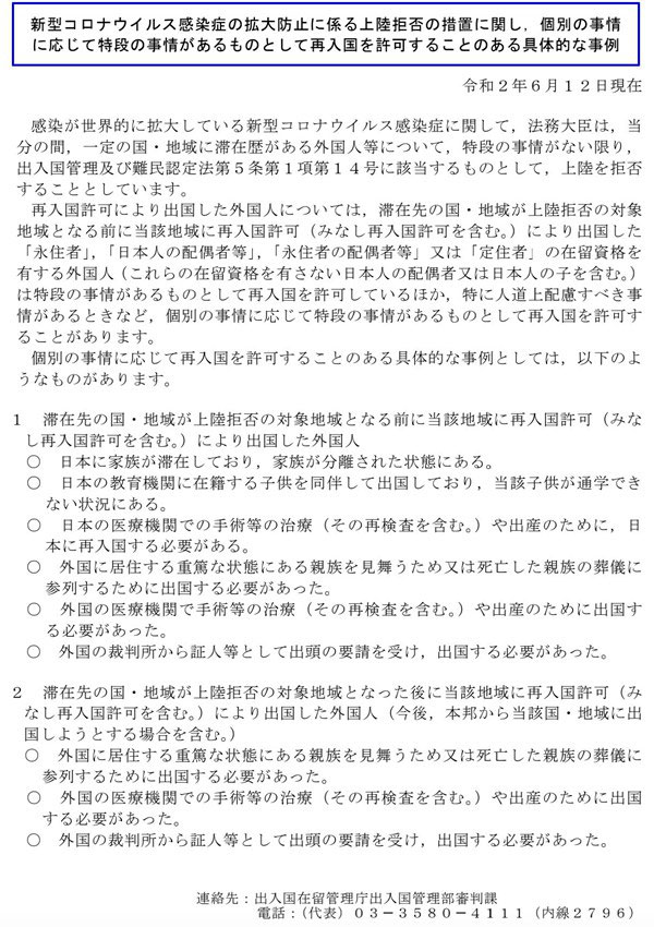 所在國在被列入禁止入境的國家和地區對象之前(一般在4月3日之前),離開日本、且有再入國許可的外國人,根據以下理由可以申請入境。