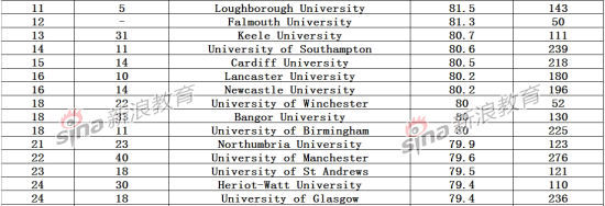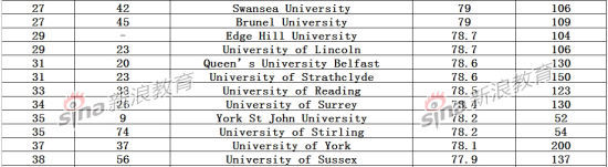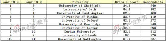 同時,在2014年的排名中躋身前10名的大學院校也包括從去年的26名上升至今年第7名的埃克塞特大學、杜倫大學(從16名上升至第8名)和諾丁漢大學(從11名上升至第10名)。